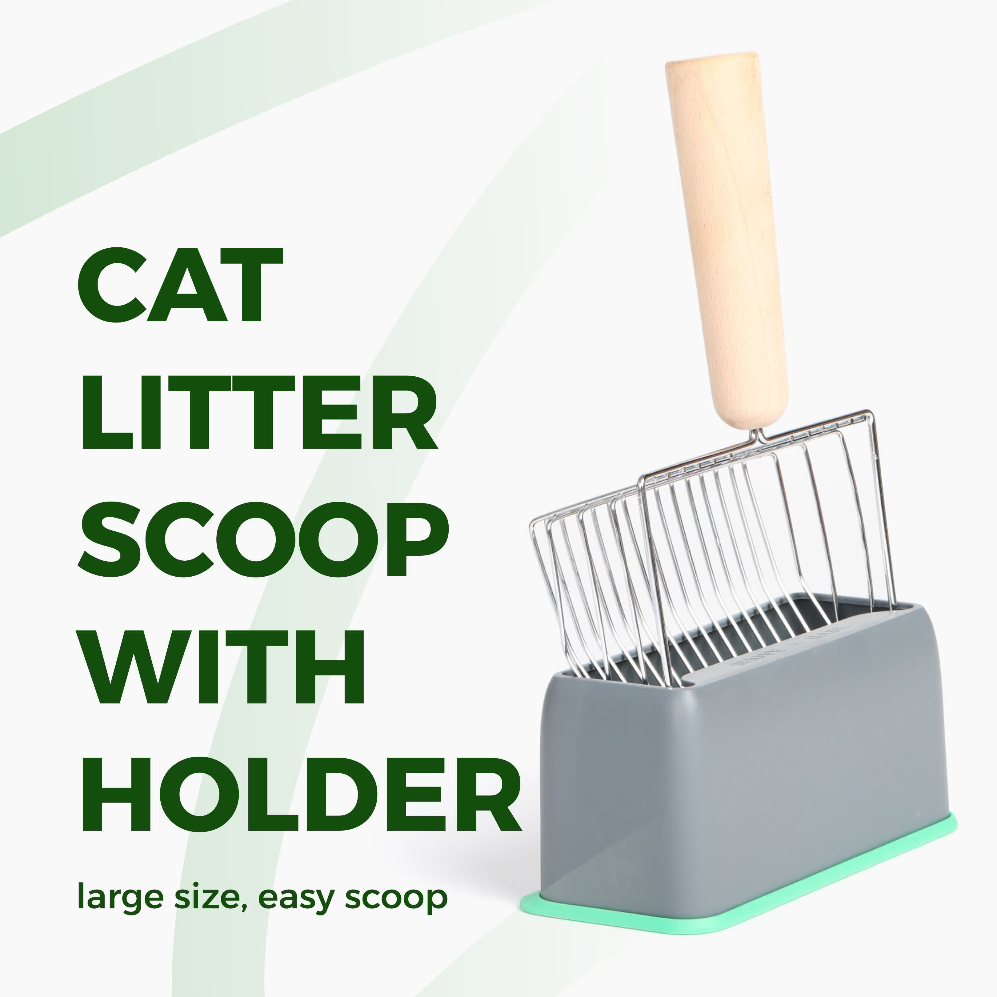 Durable steel scoop with wood handle, 11 x 5.7 inches, includes base holder (6.7 x 3.2 inches). Easy to clean and eco-friendly.